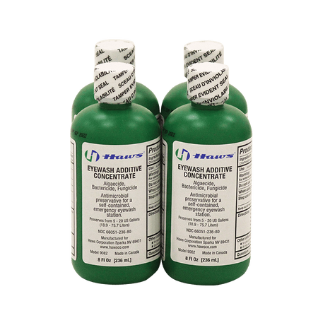 The Haws® 9082 Water Additive is a sterile, FDA-compliant bacteriostatic preservative designed for use in portable eyewash stations. This solution ensures stored water remains safe and clean for up to 4 months, making it ideal for emergency setups where plumbed water is unavailable.